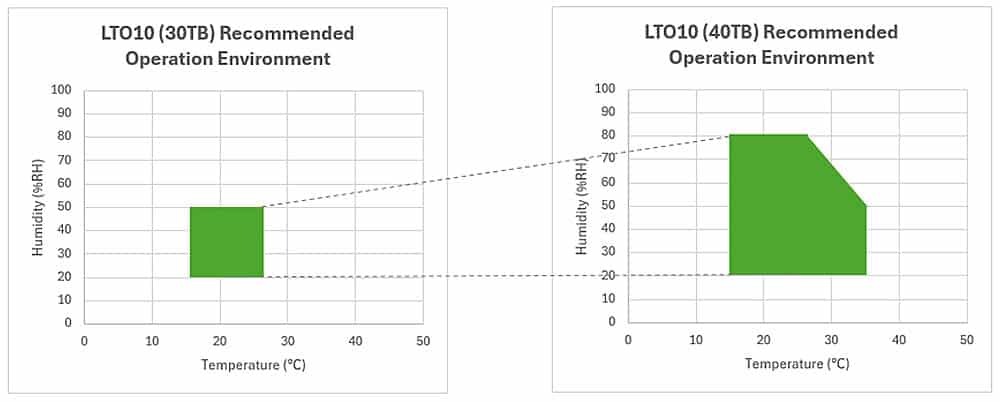 En revanche, la compatibilité ascendante n’est pas assurée : LTO-10 ne peut ni écrire sur les générations antérieures ni en lire (0-compatibilité absolue). Il en résulte que toute organisation qui adopte LTO-10 devra migrer ses données ou conserver ses anciennes librairies distinctes. La nouvelle génération améliore également la plage de température de fonctionnement (jusqu’à 35 °C) et l’humidité tolérée, favorisant la stabilité dans divers environnements data center.