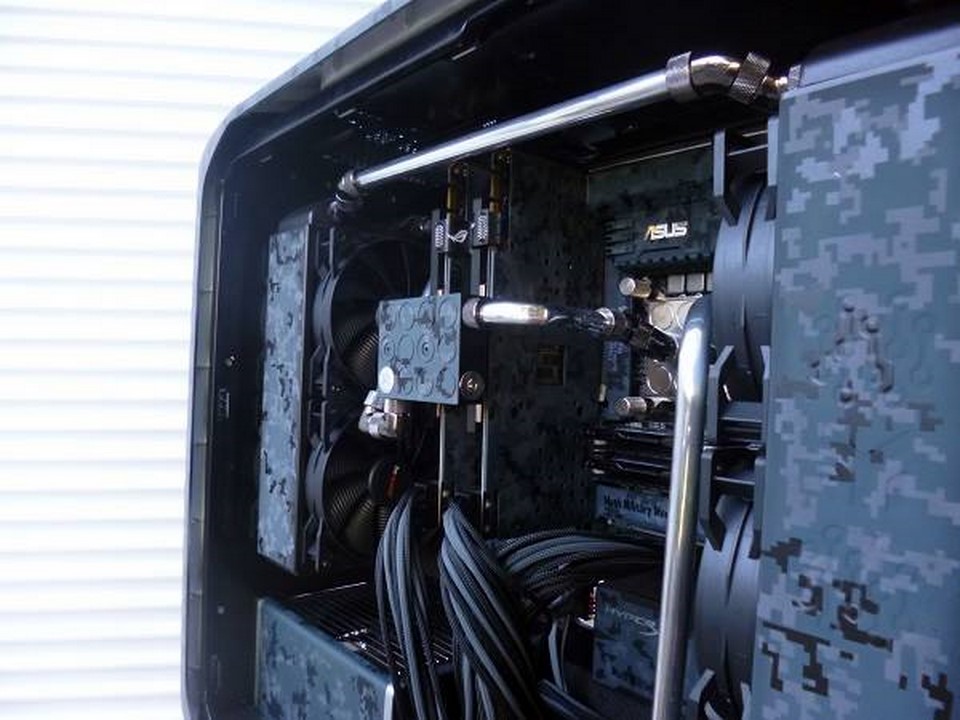 Pour le watercooling, une belle liste aussi, composée d’une pompe EK-D5 vario et son top acetal, un réservoir EK Res X3-150, un waterblock CPU EK Supremacy Elite full nikel, deux waterblock VGA EK-FC670 GTX DCII, et deux radiateurs Rad EK-XTX 240. Le moddeur s’étant donné le défi de toujours découvrir de nouvelles techniques, il est passé au tubbing rigide en alu, qu’il a ensuite poli ! L’effet est superbe, je vous laisse en juger par vous même !