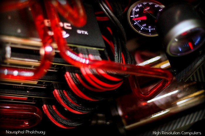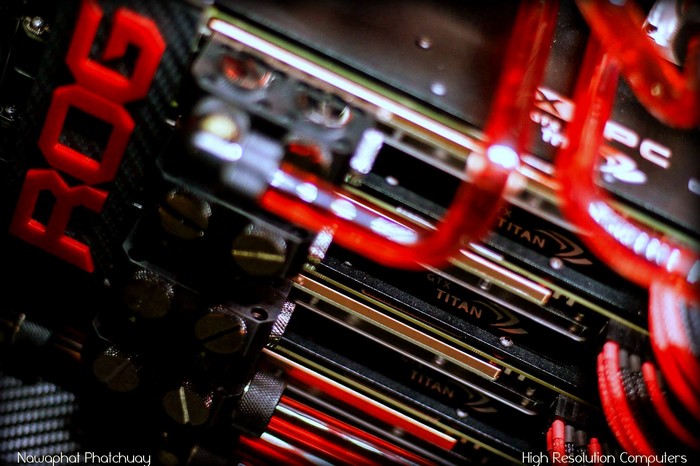 Aujourd’hui nous voulions partager une création étonnante de Nawaphat Phatchuay, célèbre membre de l’équipe HRC (hight résolution computer). Cet incroyable engin est construit autours d’une carte mère ASUS Rampage IV Extreme, et de 4 Geforce GTX Titan , oui, vous avez bien lu!!!