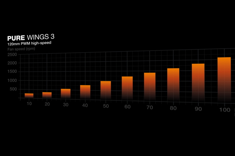 La vitesse maximale atteint 2100 tr/min, correspondant à la déclinaison “High Speed” du Pure Wings 3, choisie ici pour offrir un meilleur compromis entre flux d’air et pression statique.