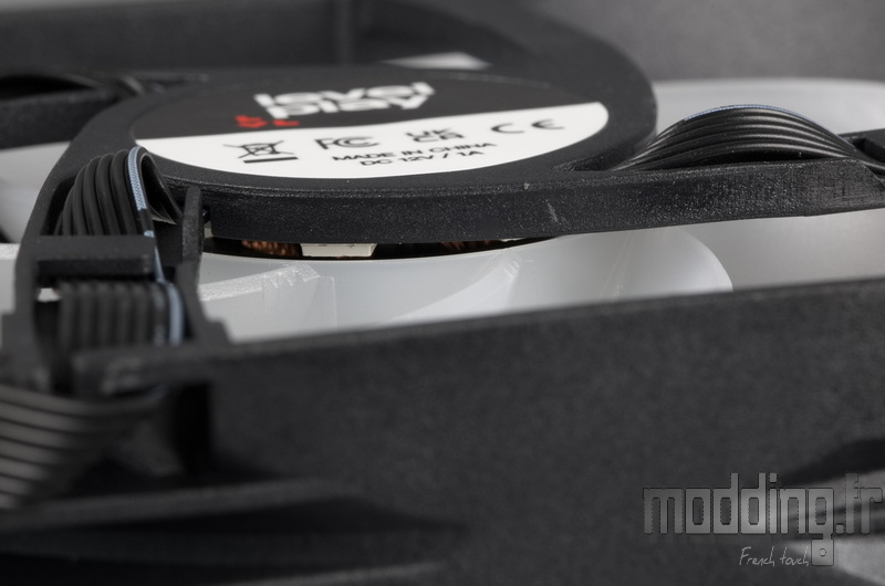 On constate que les coins de chaque ventilateur sont recouverts de patins en mousse faisant office de silentblocs. Ces derniers ont pour rôle d’absorber les vibrations et de limiter leur transmission au radiateur.