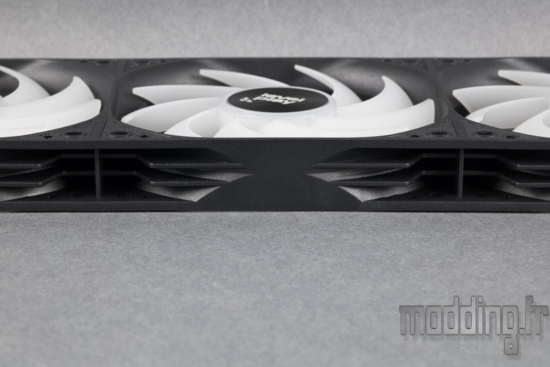 On retrouve ainsi la structure et la disposition typiques de ventilateurs 120 mm indépendants, mais réunis au sein d’un seul ensemble rigide, formant un bloc unique.