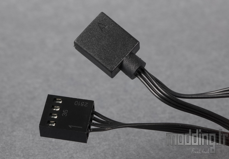 Le second se termine par un connecteur ARGB 3-pins 5V (5V/D/G) de type femelle, destiné à être branché sur l’un des headers ARGB de la carte mère afin de prendre le contrôle du rétroéclairage des ventilateurs.