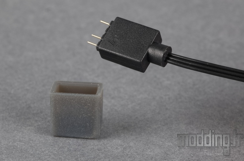 Depuis cette prise ARGB femelle est repiqué un court câble se terminant par un connecteur ARGB 3-pins 5V (5V/D/G) de type mâle, dont la connectique est protégée par un capuchon en silicone.
