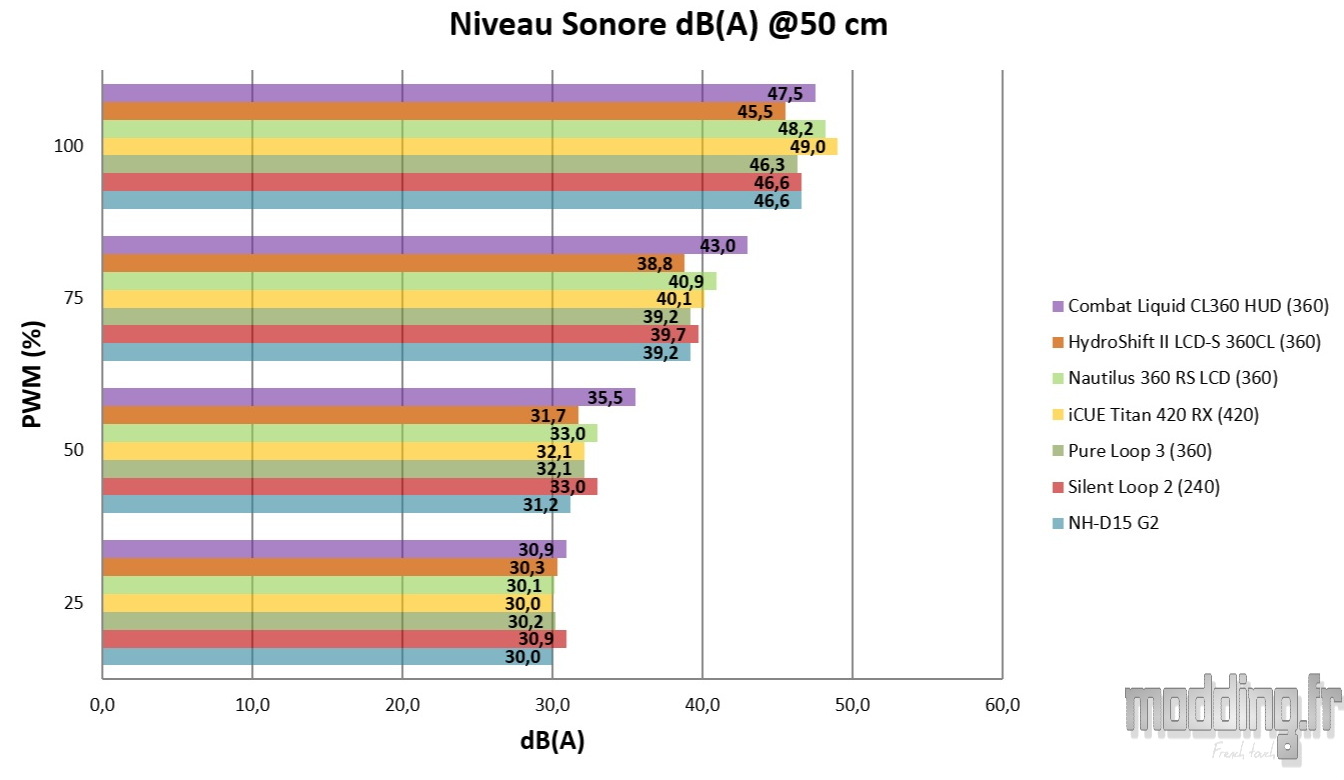Au regard des mesures acoustiques relevées à 50 cm, le Combat Liquid CL360 HUD se situe globalement dans la moyenne haute en matière de niveau sonore, sans toutefois se montrer excessivement bruyant face à la concurrence.