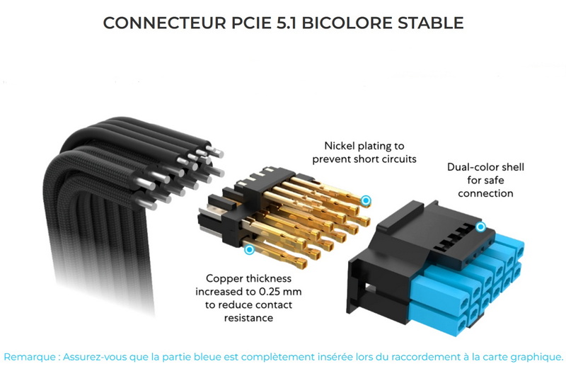 La marque ajoute un repérage visuel grâce à une zone colorée en bleu, permettant de vérifier d’un coup d’œil le bon enfoncement du connecteur, aussi bien du côté de la carte graphique que du côté du bloc d’alimentation. Ce système limite les risques de connexion partielle, problématique déjà bien connue avec l’ancien 12VHPWR.