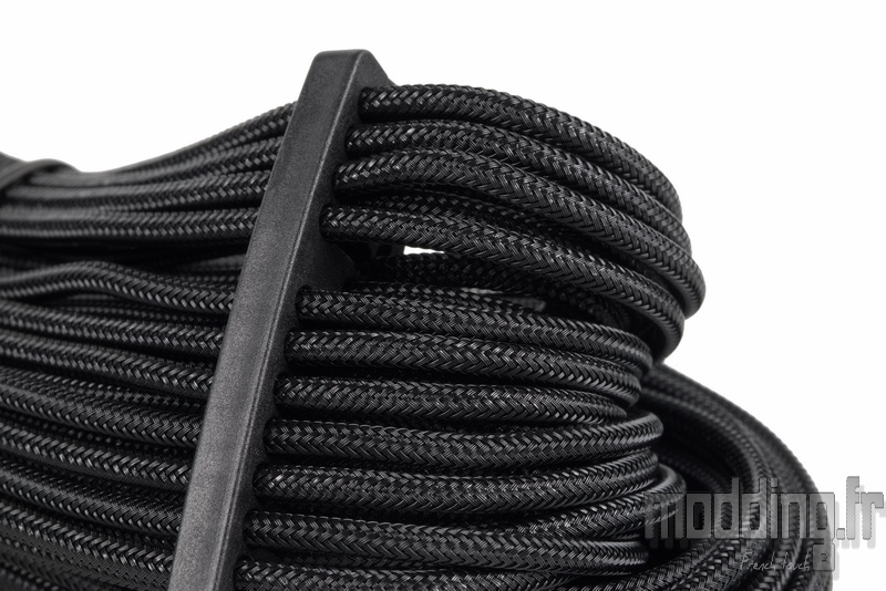 Lian Li fournit des câbles gainés individuellement, chaque fil étant habillé d’une gaine tressée noire.