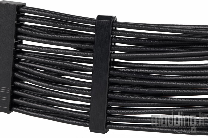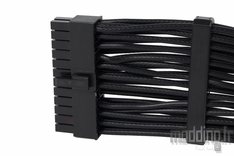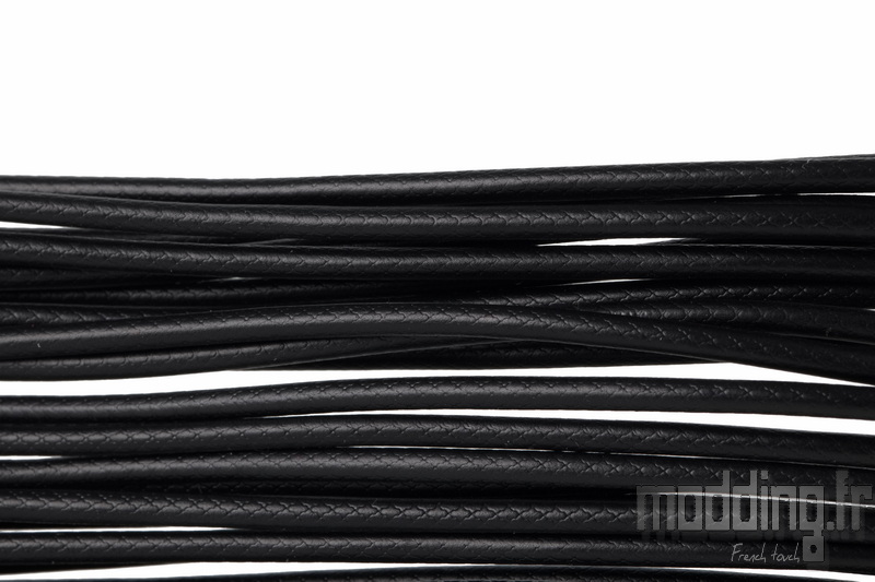 Bien que les fils ne bénéficient pas d’un gainage individuel en tresse textile comme on peut en trouver sur certains kits premium, chacun d’eux présente un embossage en motif quadrillé. Ce traitement de surface apporte un rendu visuel plus travaillé qu’un simple câble lisse, même si, dans la pratique, ce détail reste souvent discret une fois les câbles installés à l’intérieur du boîtier.