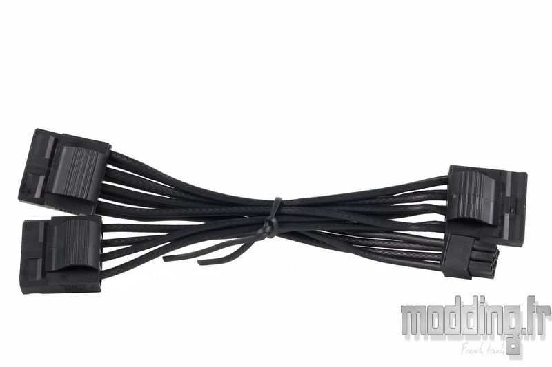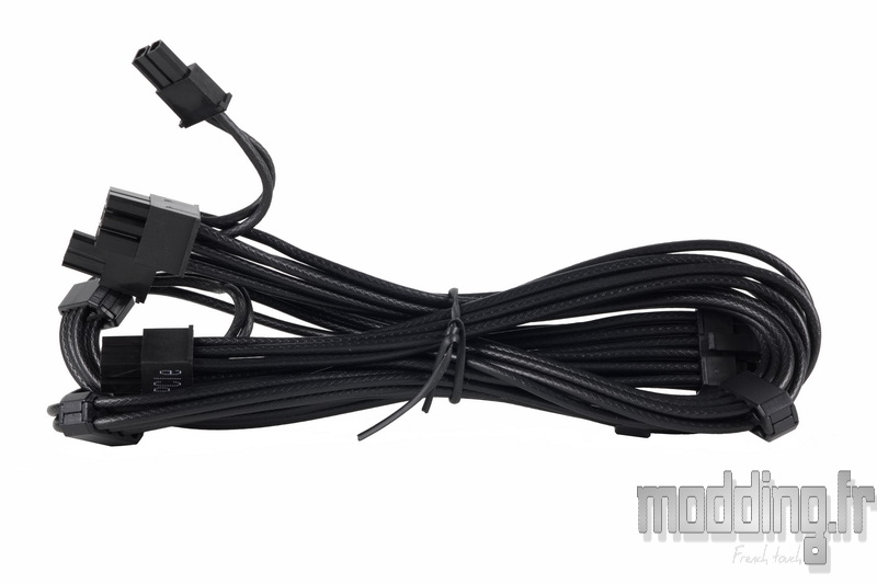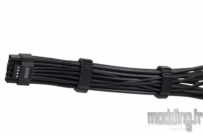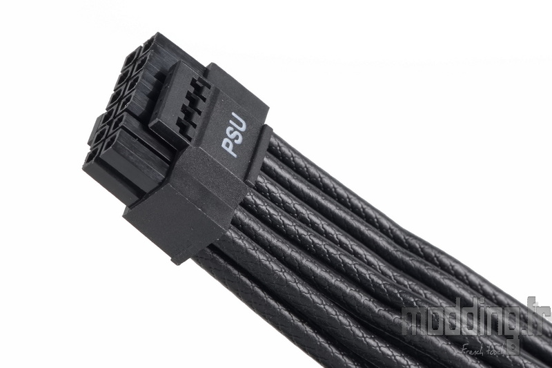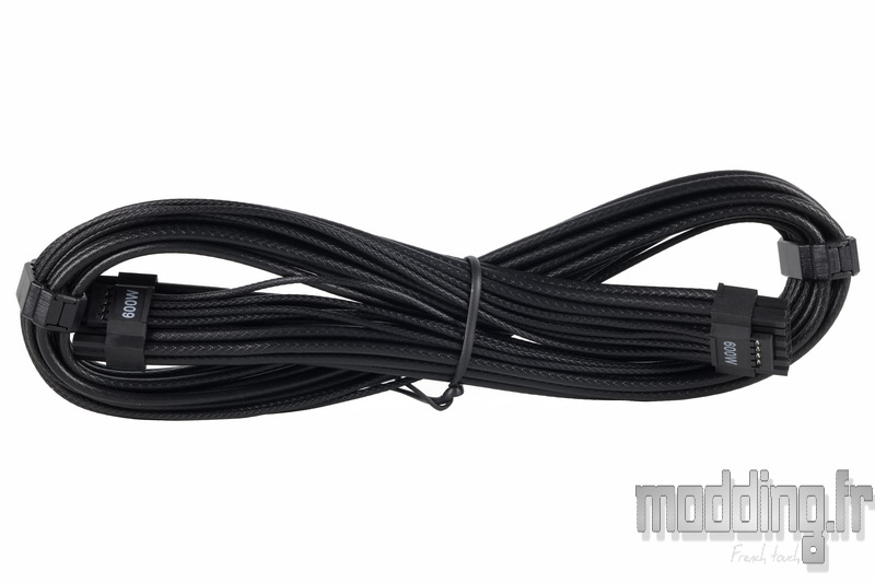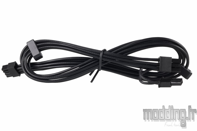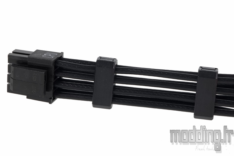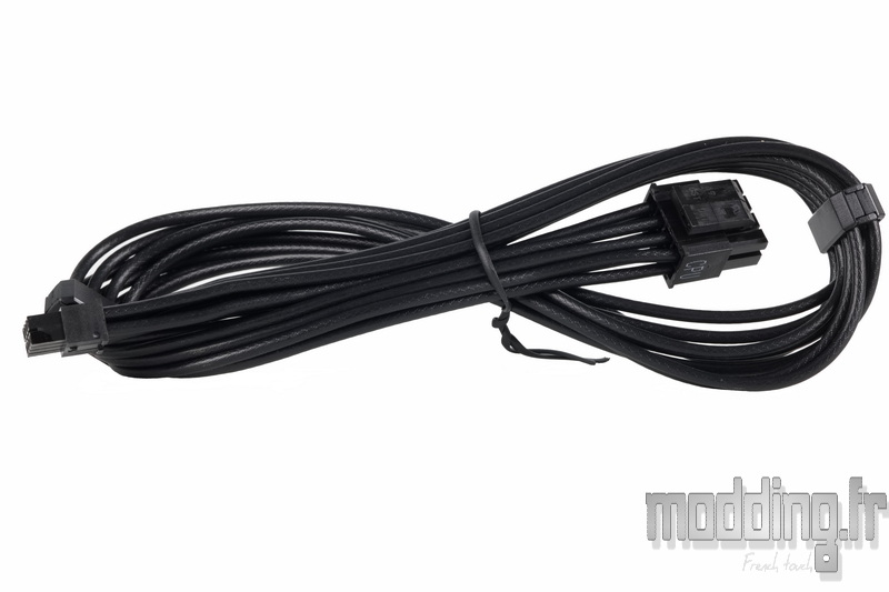 Il se termine par un connecteur 6+2 broches, permettant une compatibilité aussi bien avec les cartes graphiques nécessitant une prise 6 broches qu’avec celles requérant une alimentation 8 broches.