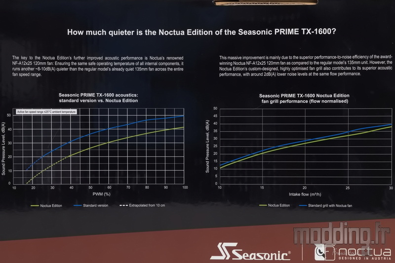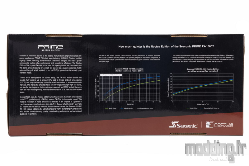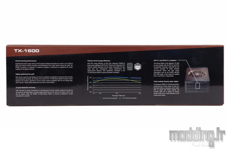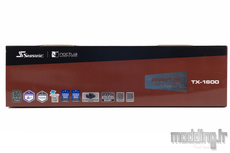 La face avant met en avant une photo du bloc d’alimentation sous un angle valorisant la face ventilée, principale singularité de cette Prime TX-1600 Noctua Edition.
