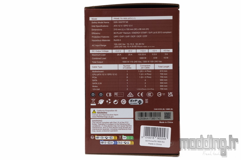 Sur l’une des extrémités de la boîte, un premier tableau récapitule les spécifications techniques de l’alimentation, telles que ses tensions de sortie, son intensité maximale par rail ou encore sa puissance combinée.