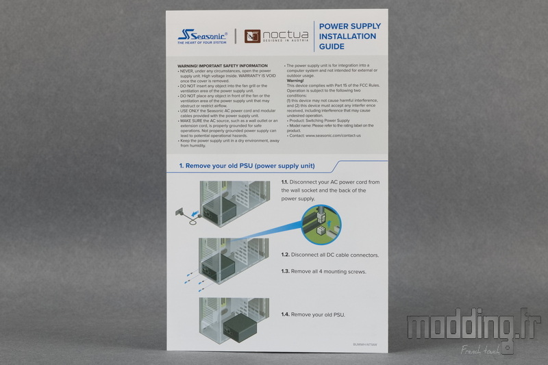 Un dépliant accompagne l’ensemble et détaille la procédure d’installation de l’alimentation au sein du boîtier PC, tout en expliquant clairement la marche à suivre pour raccorder correctement les différents câbles modulaires.