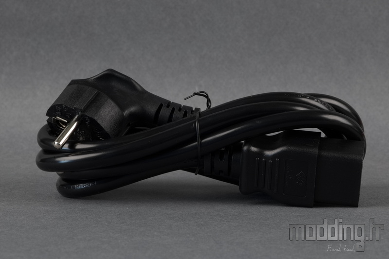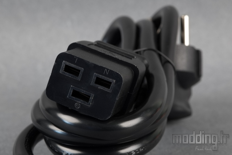 Tout comme sur la Dark Power Pro 13 de be quiet!, le cordon secteur fourni adopte une prise C19 (femelle) plutôt qu’une C13. Ses trois connecteurs sont disposés horizontalement et non verticalement, une conception plus adaptée aux alimentation haute puissance telles que cette Prime TX-1600, capables de délivrer jusqu’à 1600 watts en continu.