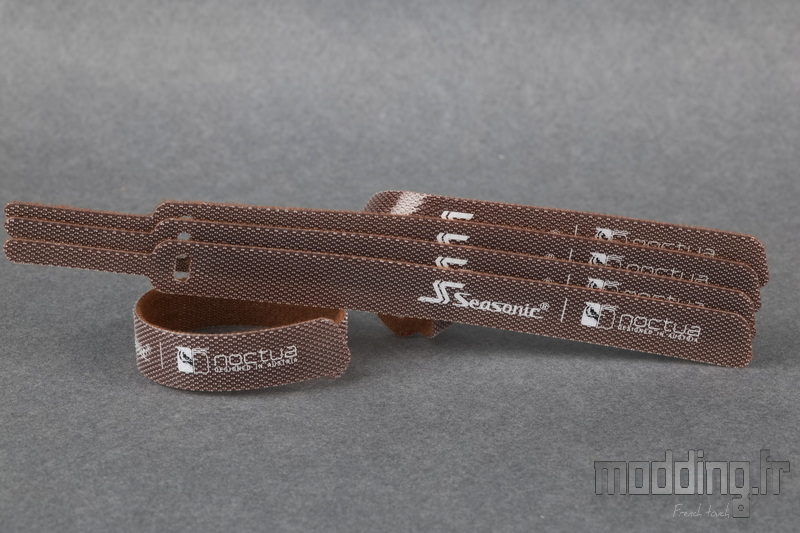 On peut tout aussi bien utiliser les cinq bandes Velcro fournies, de couleur brune et ornées des logos Seasonic et Noctua, pour regrouper les câbles avec davantage de flexibilité et préserver une esthétique soignée à l’intérieur du boîtier.
