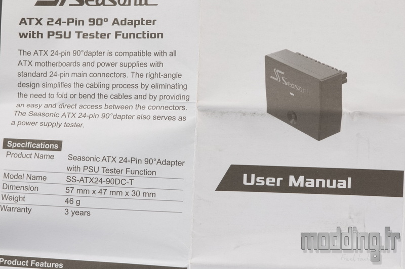Il s’agit d’un adaptateur 24 broches coudé à 90°, destiné à s’intercaler entre l’extrémité du câble ATX et la prise d’alimentation de la carte mère.