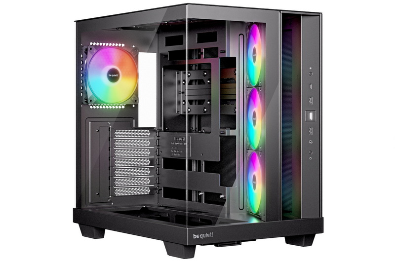 Le concept n’est pas totalement inédit : nous l’avions déjà aperçu sur le H9 Flow de NZXT. Toutefois, be quiet! apporte ici une interprétation plus aboutie, en conservant le montant vertical formant l’angle avant du boîtier — supprimé sur le modèle de NZXT — tout en créant une large ouverture permettant à la ventilation d’aspirer directement l’air frais provenant de l’extérieur.
