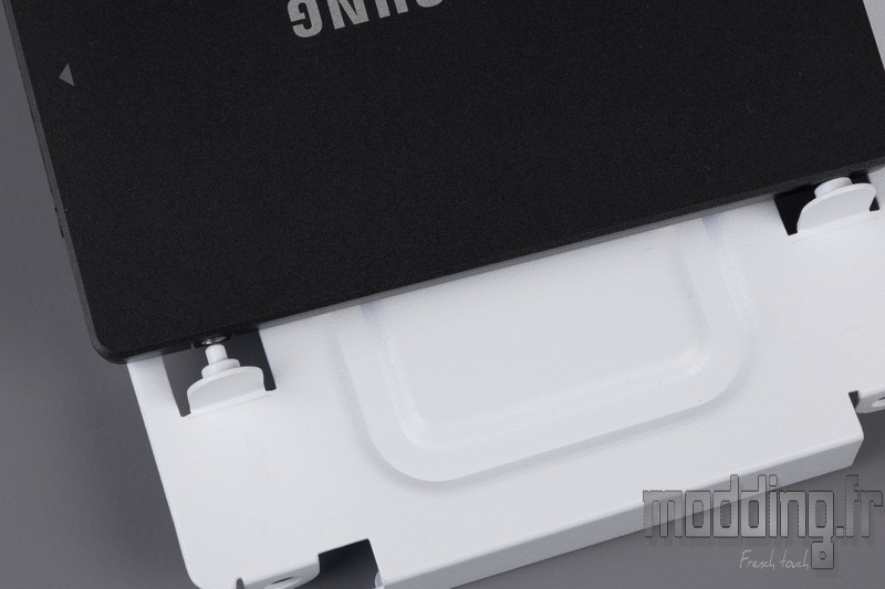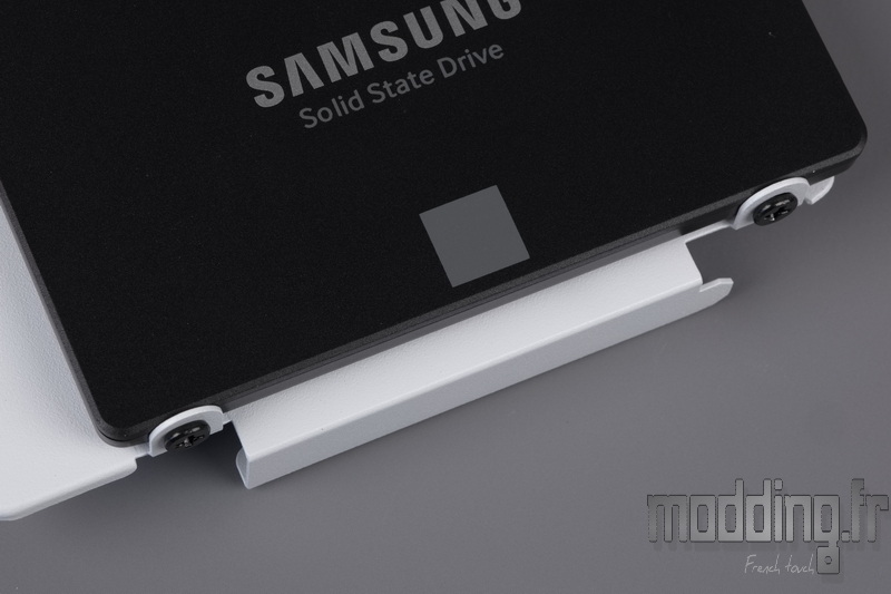 Celle-ci dispose d’ergots permettant de maintenir l’un des bords du SSD, facilitant ainsi son positionnement avant la fixation.
