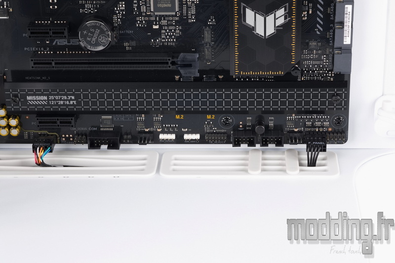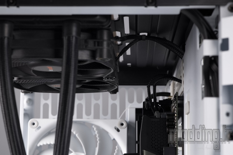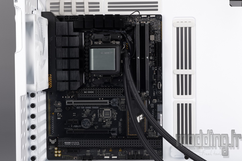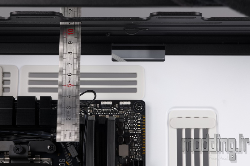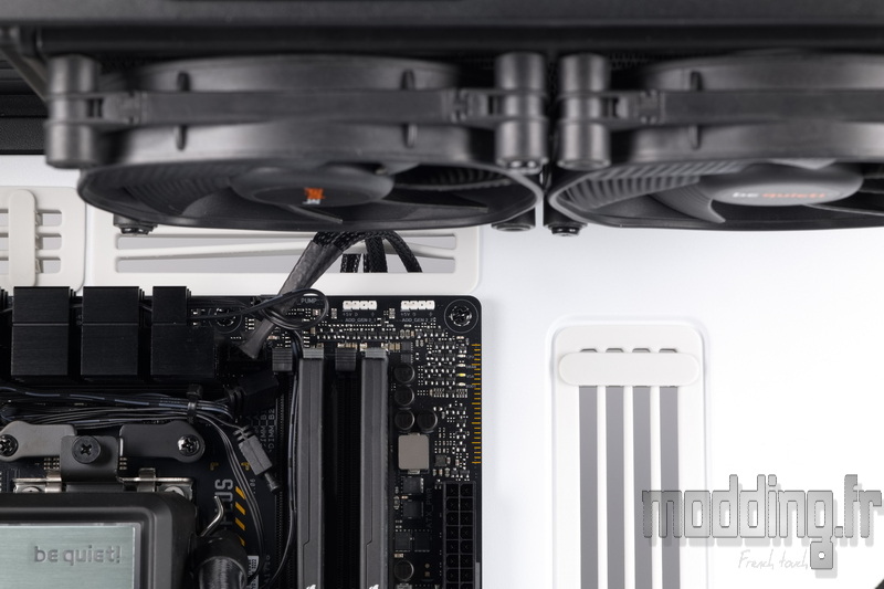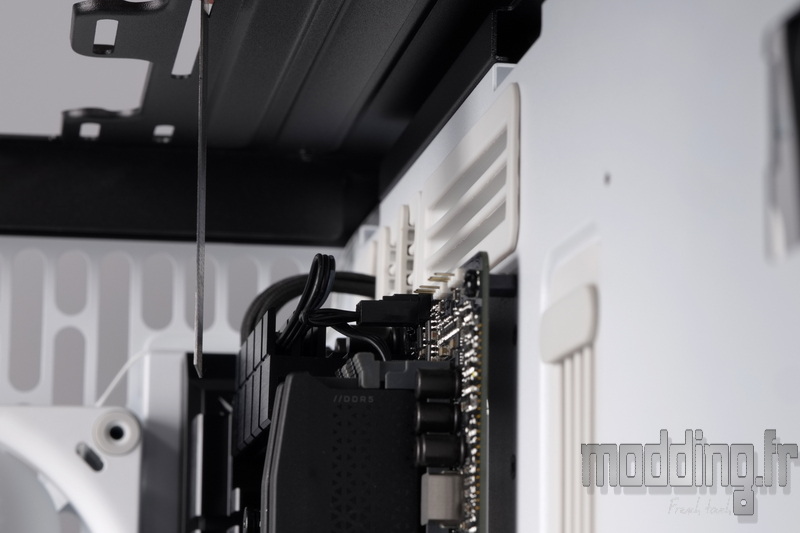 Bien sûr, cela dépendra de la hauteur de nos barrettes mémoire, mais on constate qu’une belle marge est disponible, d’autant que le réglet est ici positionné sur les points de fixation destinés à une ventilation en 140 mm.