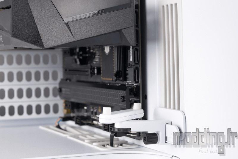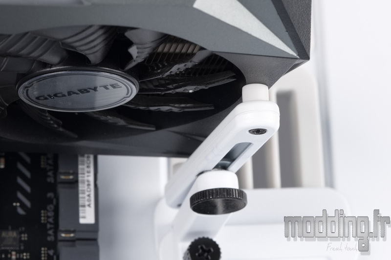 Le bras pivotant à 360° intègre deux plots en caoutchouc à ses extrémités. L’idéal est que ces deux plots entrent en contact avec le carénage de la carte graphique, afin d’éviter que le bras ne se retrouve en porte-à-faux.