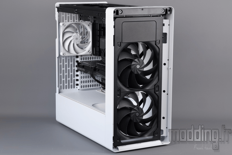 Il reste toutefois possible d’installer un radiateur de 420 mm en façade, mais uniquement sur le modèle BF 360 standard, qui dispose des rails adaptés pour une ventilation en 120 mm ou 140 mm sur le support frontal — rails absents sur la version Flow.