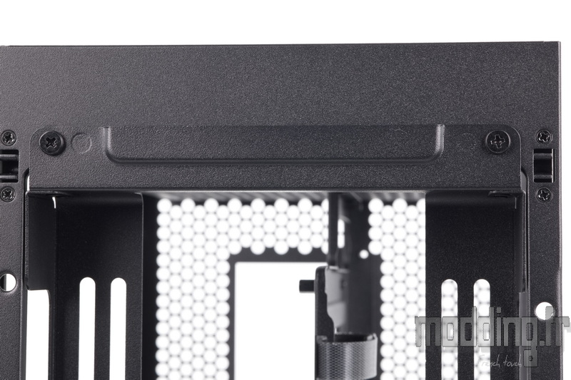 Même si cette structure participe en partie à la rigidité de l’ensemble et se trouve liée au bord supérieur du plateau de la carte mère, il nous aurait semblé plus judicieux d’opter pour une surface plus largement ajourée afin de favoriser l’extraction de l’air chauffé par les composants.
