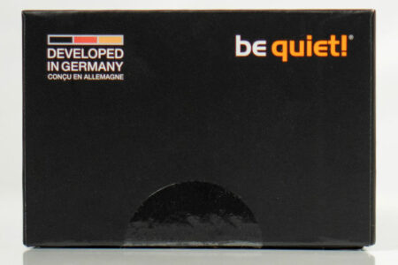 Le reste est noir, intégralement. À droite, le logo be quiet! reprend sa place en orange, comme pour ponctuer visuellement la composition. Rien d’autre. Aucun effort de mise en scène, aucun appel au storytelling. Le message est clair : on ne cherche pas à séduire en surface, on revendique une ingénierie sobre et maîtrisée. Cette tranche agit comme une signature : silencieuse, mais lisible par ceux qui savent lire entre les lignes.