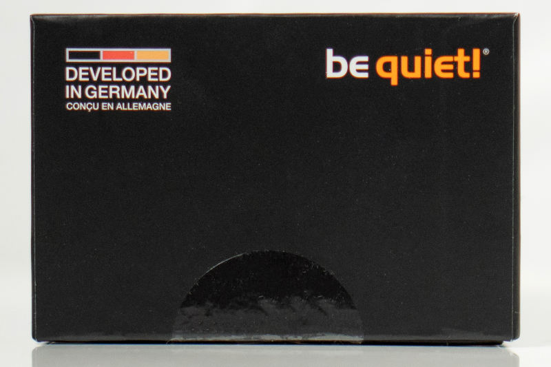 Sur cette tranche, be quiet! va à l’essentiel. Pas de fioriture : un seul visuel, deux logos, et un message limpide. À gauche, les bandes noir-rouge-or accompagnent la mention « Developed in Germany ». Un rappel discret mais assumé de l’origine du développement, qui vient souligner un positionnement technique rigoureux, hérité de l’univers du refroidissement et des alimentations PC, secteurs où la marque s’est imposée par sa fiabilité.