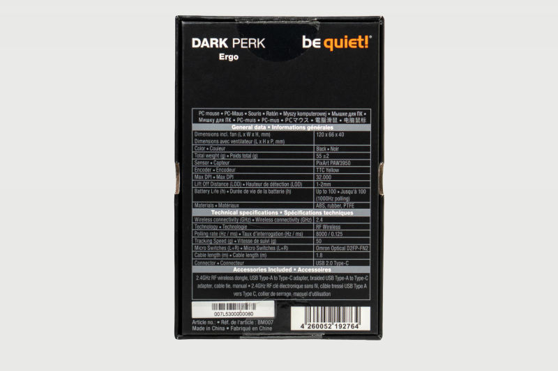 Le dos de la boîte, be quiet! troque le silence visuel de la face avant pour un discours technique brut, dense et multilingue. La face arrière aligne les caractéristiques de la Dark Perk Ergo avec la rigueur d’une étiquette industrielle : dimensions, poids, capteur, polling rate, type de switchs, matériaux… tout y est, noir sur blanc. Le choix d’un tableau bilingue (français-anglais), sobrement présenté, s’inscrit dans la continuité du positionnement global du produit : ici, on informe, on ne séduit pas.