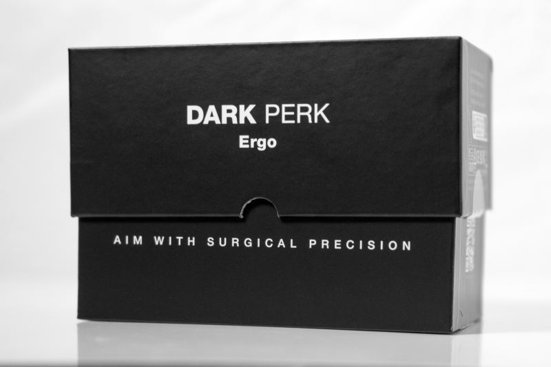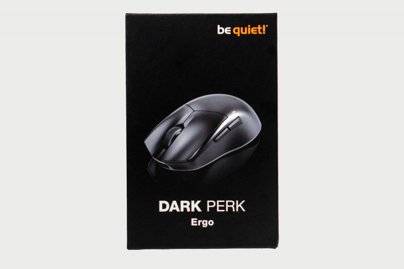 La face avant du packaging de la Dark Perk Ergo s’inscrit dans une logique de sobriété graphique parfaitement assumée. Fond noir intégral, rendu photo réaliste du produit légèrement éclairé, et typographie sans surcharge : be quiet! ne cherche pas à séduire par le verbe, mais par la retenue. Aucun argument commercial, aucune promesse tapageuse : le nom du produit se suffit à lui-même, accompagné de l’image de la souris telle qu’elle est, sans artifice.