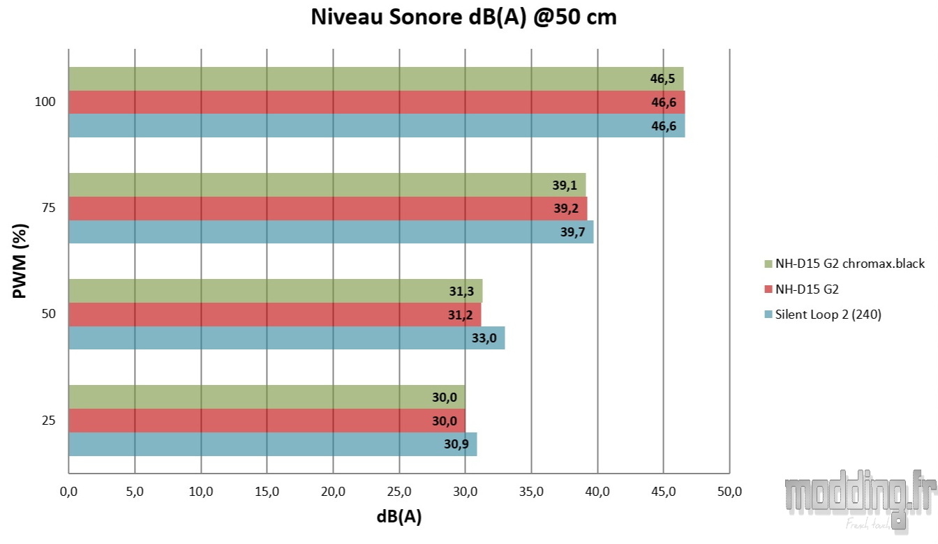 Cette édition chromax.black rend le NH-D15 G2 plus discret visuellement que la version originale. En revanche, d’un point de vue acoustique, il est logique que les deux modèles fassent jeu égal, puisqu’ils reposent sur les mêmes ventilateurs et bénéficient donc de performances sonores identiques.