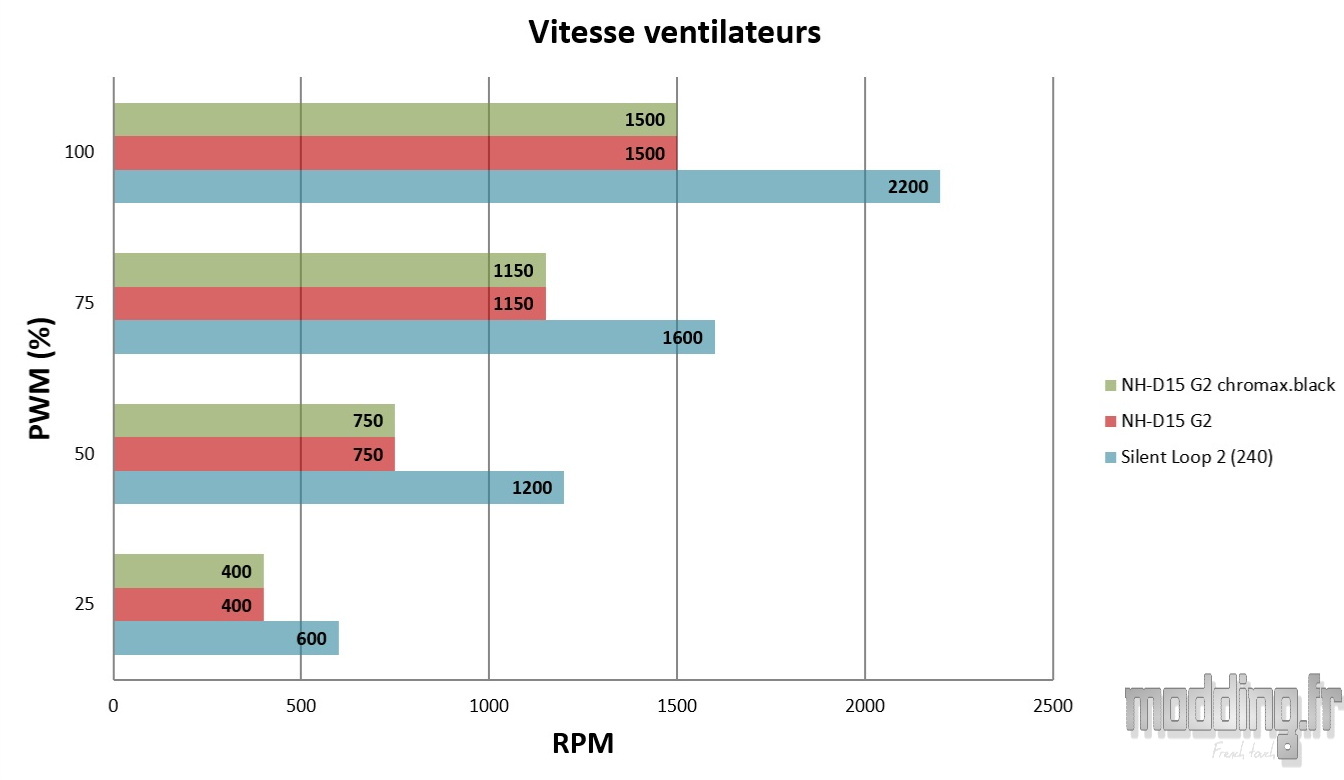 Les résultats obtenus sont ensuite comparés à ceux d’autres ventirads testés selon le même protocole, ainsi qu’à notre AIO de notre configuration de test : le Silent loop 2 (240).